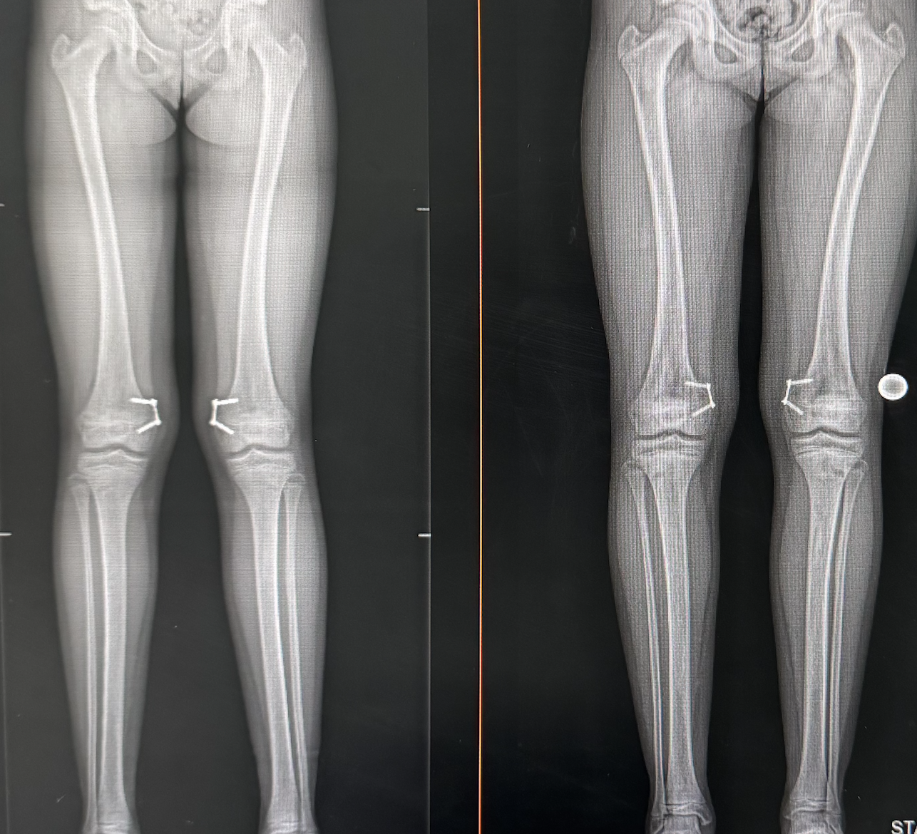 X-rays before, and after 11-year-old girl treated with Hemi epiphysiodesis using plates on the thighbone, distal femur.